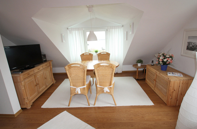 Die komplett eingerichtete Dreiraum- Dachgeschosswohnung befindet sich zentral gelegen im Unterland. Sie bietet Platz für bis zu 5 Personen mit Schlafmöglichkeit für 3 Personen in 1 1/2 Schlafzimmern und 2 weiteren Personen auf einer Schlafcouch im Wohnzimmer. Die Wohnung befindet sich in der 2 Etage. Sie bietet Seeblick auf die Badedüne. Das Bad ist mit Dusche und Bidet augestattet. Im hauseigenen Wirtschaftsraum im Souterrain findet sich Waschmaschine und Trockner. Die zum Haus gehörende Terrasse kann genutzt werden. Ein WLAN - Hochgeschwindigkeitsinternetanschluss steht zur Verfügung.